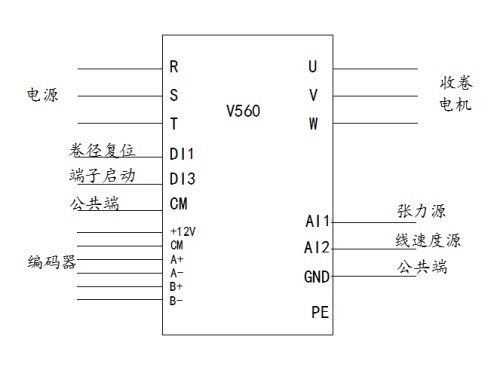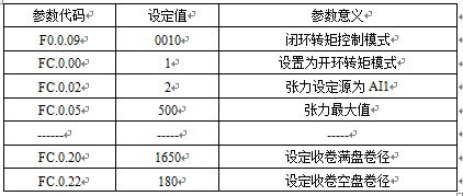 該系統(tǒng)主要介紹收卷控制,收卷控制變頻器工作于閉環(huán)矢量開環(huán)張力控制模式,PG卡和編碼器配合用來實(shí)現(xiàn)變頻器的閉環(huán)矢量運(yùn)行模式,張力設(shè)定源為外部電位器,線速度輸入源為上位機(jī)PLC控制,還有卷徑復(fù)位以及啟動(dòng)信號(hào)均來自于上位機(jī)。本收卷系統(tǒng)要求變頻器反應(yīng)迅速,變頻器頻率輸出隨線速度變化以及放卷速度還有卷徑變化實(shí)時(shí)快速調(diào)節(jié),并且變頻器的過載能力要強(qiáng),要求系統(tǒng)反應(yīng)迅速,運(yùn)行平穩(wěn)。