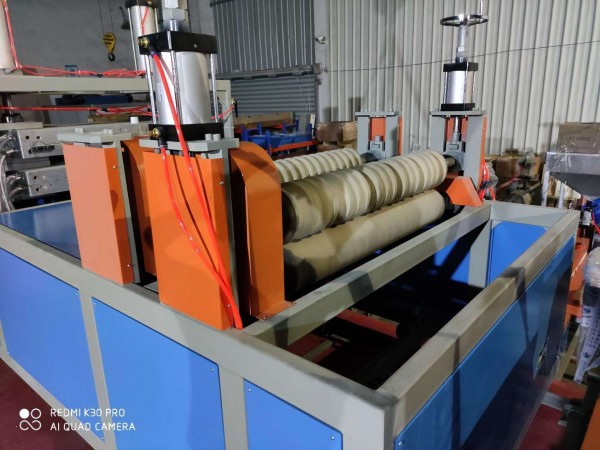 PVC中空雙層波浪瓦生產(chǎn)線:主要由彈簧上料機(jī)(主機(jī)配套用)、SJSZ80/156錐形雙螺桿擠出機(jī)、真空上料機(jī)(單螺桿主機(jī)配套用)、料斗干燥機(jī)(單螺桿主機(jī)配套用)、SJ50單螺桿擠出機(jī)、中空波浪瓦擠出模具、共擠分配器、中空波浪瓦成型模具、真空定型臺、瓦型橡膠牽引機(jī)、橫向切割機(jī)、不銹鋼滾輪式堆放架。輔機(jī)部分:高速混合機(jī)組、破碎機(jī)、磨粉機(jī)。