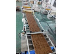 加入錐雙螺桿擠出機,進行加熱擠出→進入板材模頭進行擠出成型,成型的片材經(jīng)過四輥壓光機,基材進行定型→貼彩膜→貼耐磨層→冷卻→切割;